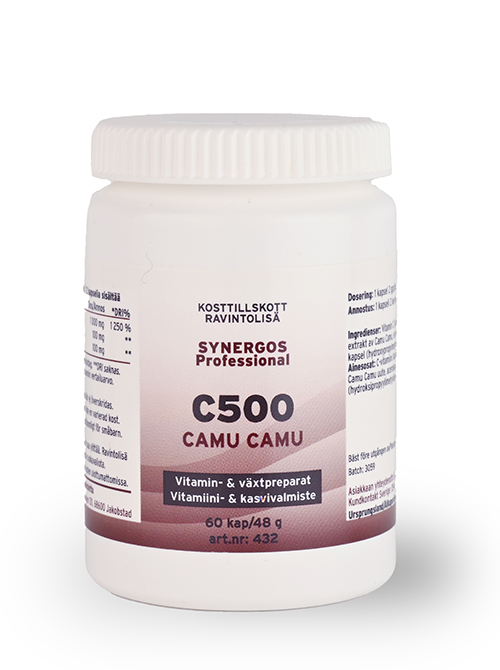 Ingredienser. Vitamin C (kalciumaskorbat). Extrakt av Camu-Camu. Extrakt av acerola. Fyllnadsmedel (magnesiumsalter av fettsyror). Kapsel: Gelatin.