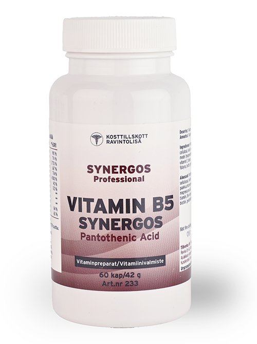 B5 Pantotensyra Synergos är ett avancerat kosttillskott som bygger på bredspektrum- och synergiprincipen. Varje kapsel ger 250 mg pantotensyra tillsammans med pantotensyrasynergister